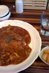 いずみカレー」で食べるため。近辺の情報をネットで調べてたら評判のよかった店です。写真は牛すじカレーと別注文の島らっきょう。カレーは欧風のダシがきいた(よい意味での)洋食カレー。ライスがアーモンド型に盛られています。じんわり辛さがきて、おいしうございました。
