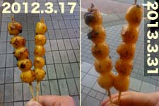 君には表現の工夫や発展というものはないのか、と己にツッコミたくなる昨年と今年の写真。大須・新雀本店の名物みたらし団子。甘味が少なくサッパリした正油味。名古屋に行くとつい食べちゃう。