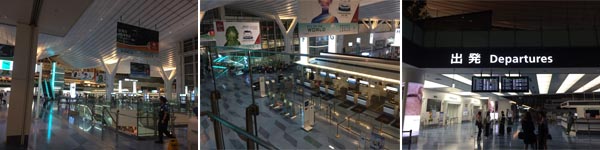 寝静まった空港内。深夜ともなると、売店も一部の飲食店(吉野家・モス等)以外は閉じており、とくにコンビニが閉じているのは要注意です。空港に着く前に最後の買い物を済ませるなり、あきらめて現地調達をめざすなりしましょう。