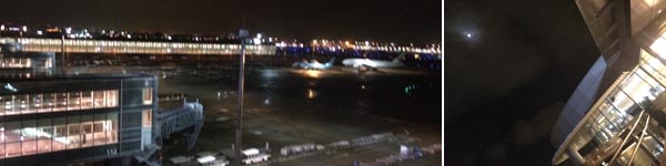 深夜でもデッキに出ることが出来ます。曇り空の隙間から、月が出ていました。