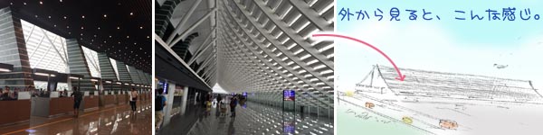 内側から見てもなだらかな曲線を成している天井?梁?は、外から見ると中華風の屋根を模しており、お主やるなという感じ。
