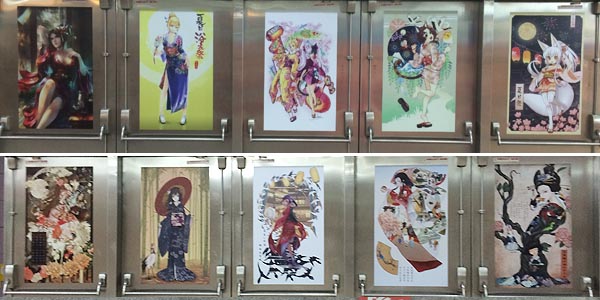 日本橋をイメージした橋の下、赤い布の床几(?縁台?)では眠る人あり、トランプに興じる大学生らしき若者の一群あり。