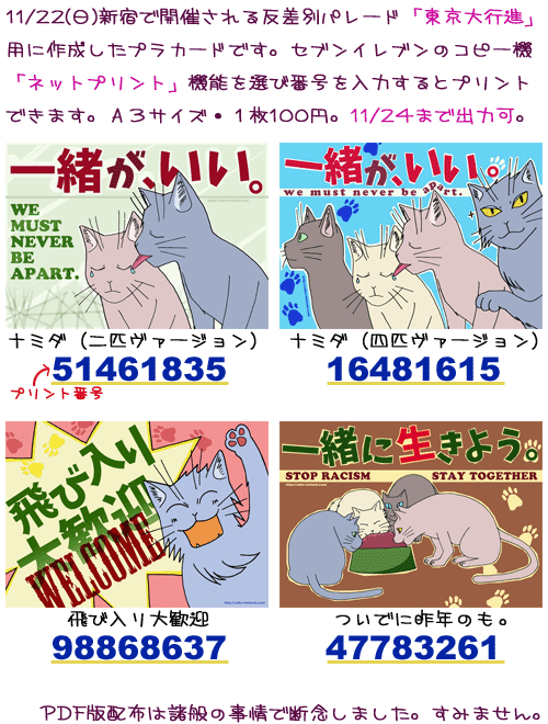 カウンター側のパレード「東京大行進」に昨年参加したとき、色とりどりのニャンコが同じボウルのカリカリを食べる絵をプラカードにした。暢気な、ユルい、と真面目なひとには怒られそうな表現だけれど、たとえば同じモチーフで差別する側が描こうとしたら「いろんなネコが居るなかで、他の毛色の猫たちは汚くてジャマ。特定の毛色の私たちだけが素晴らしく、皆からうらやましがられてる」とは、とても描けない、非対称なメッセージを打ち出せると考えた。