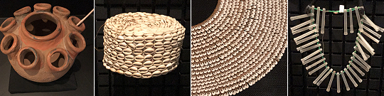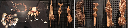 そして印象的だったのが、アフリカで現在つくられてる子供のお守り用の首飾り。貝が貴重品である内陸部では、逆に大量の貝を用いることで呪力や権威を表す装飾品が作られたけれど、この(画像右端)首飾りの材料は注射針のカバー。単に綺麗だからというのでなく、乳幼児の健康を守る、予防接種などにまつわる品だからこそ、信仰に近いかたちで珍重されているのかも知れない。そう考えると、遠く海を隔てた土地での、人の営みに、また共振できる気がしたのでした。