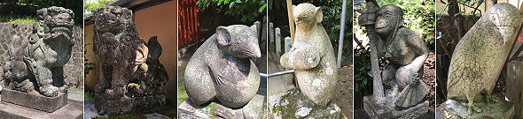 参道の灯籠には、人々が寄進?したらしい馬やら牛やらネズミやらの小さな人形がポツポツ置かれてるのだけど、中には