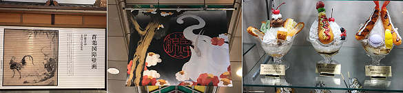 社会参加が終わったあとの京都・錦小路はおおむね店も閉まってシャッターが降りていたけど、10軒に1軒くらいシャッターが伊藤若冲の日本画をあしらったデザインになっていて、こういうギャラリーも悪くないと思いました。アーケードの天井から下がった垂れ幕も若冲で、こんなところで(北野天満宮で会って以来の)象とも再会。