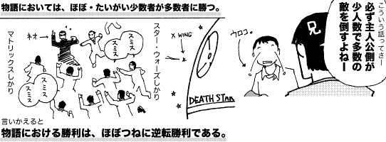 これは既に、同人誌の形で述べたことだが、物語においては、少数者が大多数を、不利な者が強者を打ち倒す。ヒーローが圧倒的な物量で、しょぼい敵を倒すことは、たぶんほぼないだろう。同様に、巨悪は暴かれ、無理めの恋が実り、鬱々とした毎日を送る者に救いの可能性が示唆される。