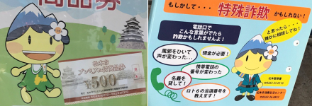 今のところ、街の推しは松本城・同市出身のアーティスト草間彌生・マスコットキャラクターのアルプちゃんらしい。プレミアム商品券を周知し、特殊詐欺への警戒をうながすアルプちゃん、かわいい。
