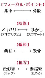 同様に、絵の輪郭やコントラストも「シャープ」と「ぼかし」の反復運動として捉えられる。陰影にメリハリをつけるのはテネブリズム(代表的な作家は