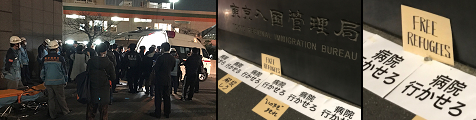 後述するが入管問題に前から関心があり、中の人が外の友人や家族と連絡をとるためのテレホンカードを支援したり、街頭や入管前でのスタンディングなどに参加していた経緯があった。「それに、せっかく乗り放題の切符があるのだし」という小物っぽい理由で品川へ。19時半。倉庫街の周囲にビルの明かりもなく、真っ暗な東京入管前に到着。外の家族が呼んだ救急車が真ん前の車道に横づけになりスタンバっているのに、入管のガラス扉は閉じられたまま。寒気がした。