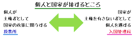 モーリス-スズキは個人と国家が遭遇する、二つの両極端な場所を挙げる。一方に市民が主権者として国家の方策に関与する「民主主義の聖地」としての投票所。その対極にあるのが「国家が非市民に対処する」出入国管理所だ。後者は権力が恣意的に行使される