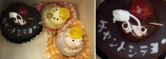 コロナ退散祈願。松本「翁堂」のプチどうぶつケーキ(あひる・ブタ)と、マスクが外れかけ「チャントシテヨ」と言ってるタヌキのプチケーキ。あひるのクチバシはピーナッツ。可愛かろう!