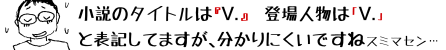 が、後者について語れることは、今の自分にはない気がする。歴史の背後に存在する謎の…という設定は後に書かれた「競売ナンバー49の叫び」の秘密組織トライテロを彷彿とさせるが、陰謀論やオカルト(あるいはファンタジー)めいた設定のわりに「V.」はそれだけで雑多なエピソードと物語を牽引しうる強靭なワイヤーではない。