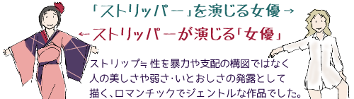 弱虫というか、馬鹿正直というか。大阪から来て広島で恋に落ちた主人公は、ヒロインのそばにいたくて、そのままストリップ劇場に転職を決めてしまう。スタッフになればステージは観放題、逆に観てなきゃいけない(トラブル対応係として)ようなものだが、彼は彼女のステージだけは観ようとしない。「友達でいい」という自分の言葉を守るためか、「観客とは恋仲にならない」という彼女の言葉を真に受けて「だったら観なければ…」と一縷の望みを守るためか。いずれにしても融通のきかない生真面目さで、しまいには「どうして私のステージは観てくれないの」と言われてしまう…
