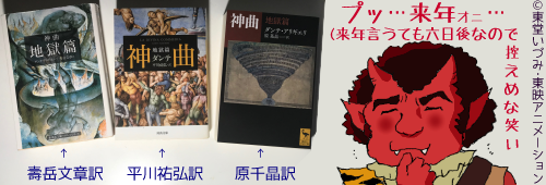 神曲』日本語訳の読み比べである。とりあえず地獄篇だけでもと思い、三種類を揃えた。来年さいしょのサイト日記は、この話になります。それでは皆さま、よいお年を。
