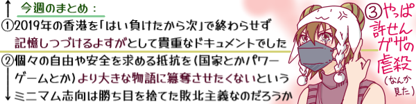 それでは勝てない・現に香港は負けたじゃないかという「現実」主義の反論もあるかも知れない。けれど、逆に日本で吾々が政府与党の悪質な政策に反対する時「国際世論でも非難の声が高まってくれないか」はまだしも「皇室や(宗主国としての)アメリカ様が不興の意を示して日本政府を平伏させてくれないかなあ」みたいに想像してしまうのも、また別の意味で「そんな発想だから負ける」ではないか。