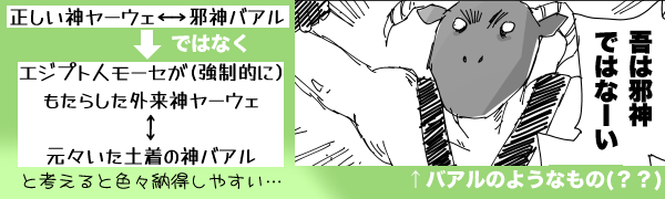 おぼろげにでも旧約聖書のことを知っていれば、民が厳格なヤーウェを厭って(聖書的には邪神とされる)バアル崇拝に走ったこと、民の造反に怒ったモーセが十戒の石板を叩き割ったこと、それに何より国じたいがイスラエル王国とユダ王国に二分されたことなど、思い当たるふしがあるだろう。ユダヤ人にとって「ユダヤ教」と呼ばれるモーセの教え・唯一神ヤーウェが外来の異物であったと言われれば、納得できてしまう要素は少なくない。