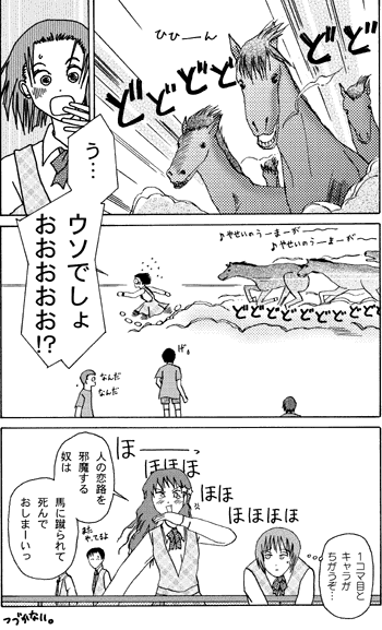 あえて問題を挙げるとしたら それは彼女のジャンルが創作JUNE(しかもハードコア)だったことくらいだが。m*3マイムラのみぢかいまんが。 2005.03発行 A5版 100ページ 500円+送料 250円+税(BOOK WALKER)[収録作品] グリコ/女占い師の悩み/バナナ/女の子ってワカンナイ(もしくはそれ以前の問題)/loveless/愛は容赦ない/約束の男/愛は容赦ない2003/カミング・ホーム(thin line between life and death)/ちょんまげとか初めて描きましたよ/ソフトクリーム/soma/なんてったってアイドル/love is cash/私の人魚はよい人魚/魔法少女を敵に廻すと非道い目に遭う/魔法の○○○/walking in your footsteps/レベッカ/フルールバスケット、もしくは楡沢実花の青春/ところがどっこい。/カミング・ホーム(a sort of homecoming)/ホットチョコレート(including彼女はパブロフの犬) 短篇・掌篇というより瞬間芸とか奇術に近い、2002年〜04年に描かれたペーパー漫画に課外活動・未発表新作などを加えた小ネタコレクション。 名古屋コミティア読者ハガキ投票で一位をいただいてました(ひょんなことで半年後知る)。そりゃあ嬉しいさ!その3月の名古屋に間に合わしたくて、仕事の出張先にまで原稿用紙もってって、宿で原稿かいたんだもん。そういう意味でいっとうほしかった勲章です。ありがとうございました。 「カミング・ホーム(thin line between life and death)」Web公開中。 マリみてまんが「ホットチョコレート」Web公開中。 【短篇掌篇集・とにかく数読みたい人向け・内容軽め】 |