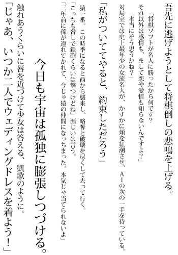 小説だけど一作140字で読みやすい「ついのべ」や、その連作を中心に、ラブコメからファンタジー・世界滅亡まで。繁茂する植物に空が塞がれ、地上は水没した近未来を描く「ナッシング・バット・フラワーズ」、人気キャラ中薗理恵きゅんの小学生時代を描く「氷が水になるとき」ほか約160篇。