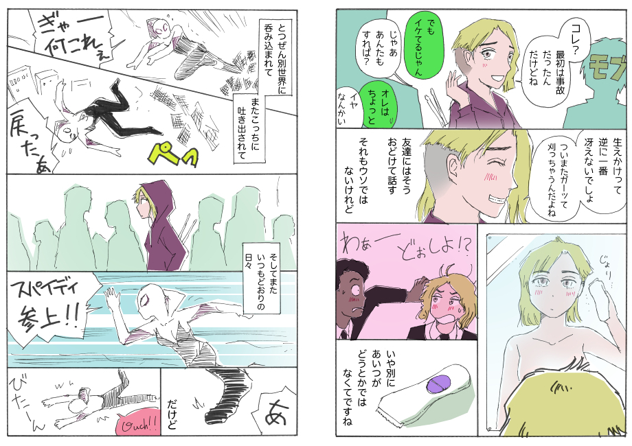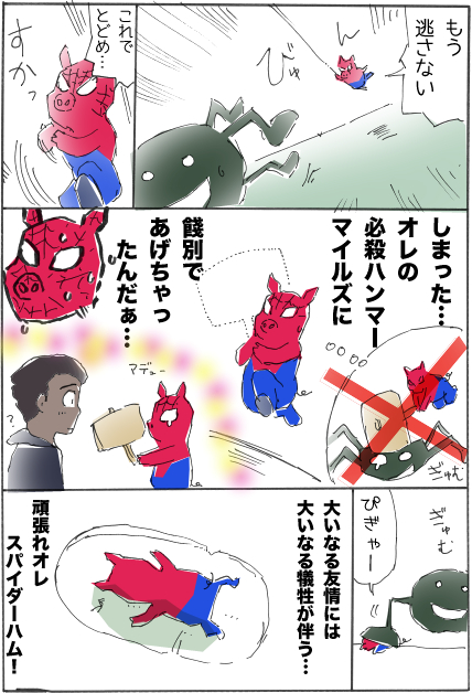 ←前 次→ cartoons+目次に戻る ホームに戻る 『スパイダーマン:スパイダーバース』映画準拠のまとめ。 たとえば1979年のひとに「これが2019年のアニメ」「これが2019年のスパイディ」と 見せつけるような、未来志向の作品でした。主人公がヒップホップ文化を体現する ブラックの少年なのも「アメリカのこの20年は間違ってなかった」という強い自恃を感じました。 ![]() SP//drのギミックが羨ましかったので 『ゴーバスターズ』のウサダ・レタスに実装してみた。 ![]() 自分の世代だと蜘蛛女といえばコレ。 ![]() 自分の世界に戻ったあとのグウェン。 もっと「あー折角なら皆そろってるときにナヴェパーティーとかしたかった」 みたいな軽いノリにするつもりが、思ったよりウェットになっちまいました。 ![]() ![]() そしてスパイダーハム。 ![]() |